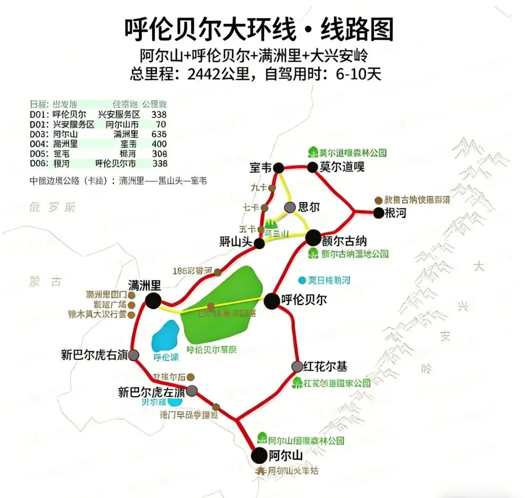 行程安排:呼伦贝尔→兴安服务区→阿尔山→满洲里→室韦→根河→呼伦贝尔(环线闭环,不走回头路)。