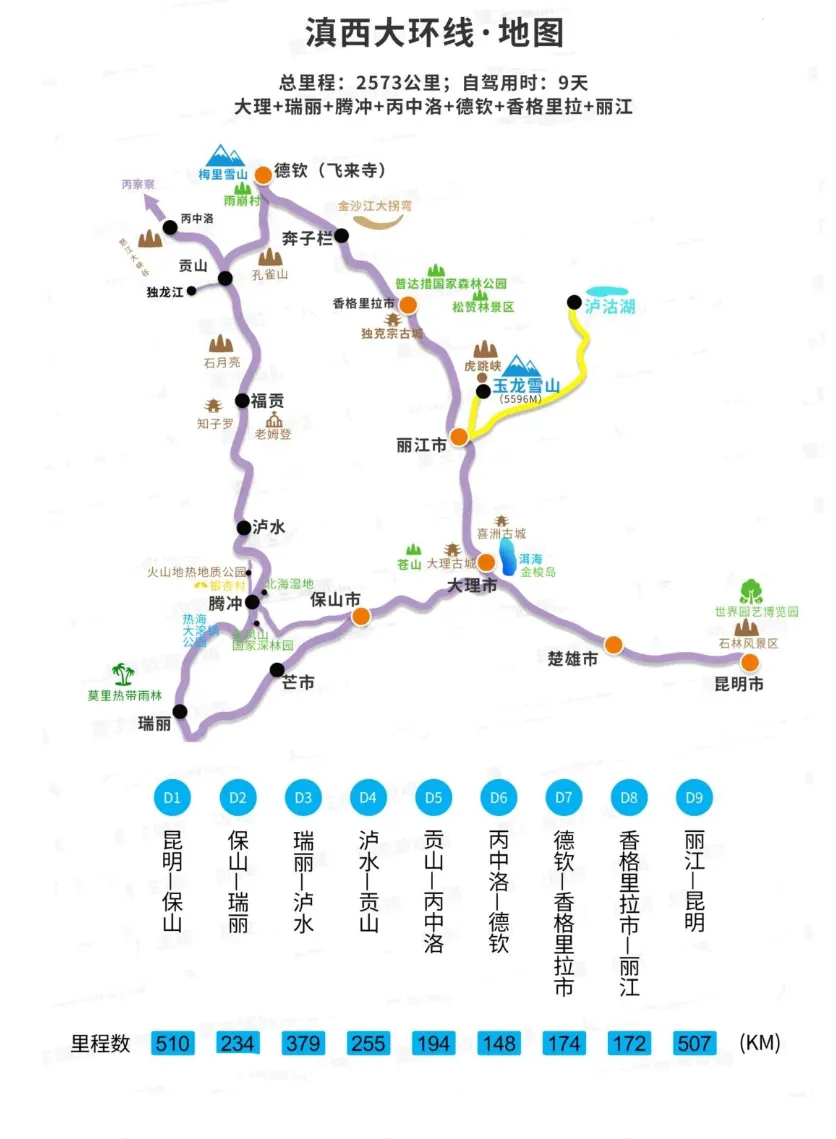 行程安排:昆明→保山→瑞丽→泸水→贡山→丙中洛→德钦→香格里拉→丽江→昆明(环线覆盖滇西核心景观与人文节点)。