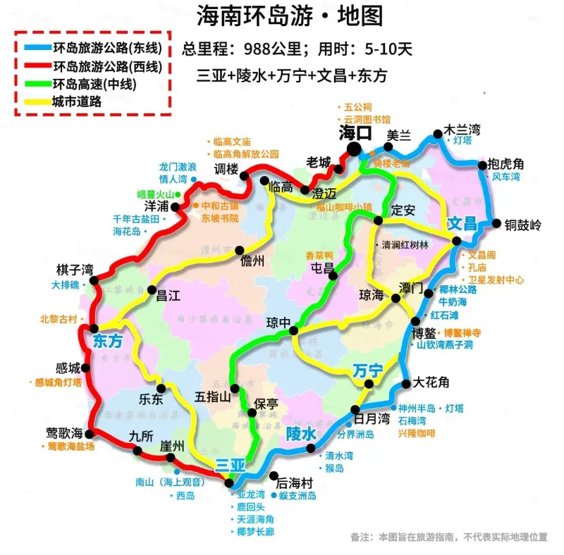 自驾信息:全程约988公里,自驾耗时5-10天,可根据自身节奏灵活调整。全程依托海南环岛旅游公路,路况平整良好,无任何驾驶难度。需要注意的是,海南地区的油费普遍比内地高出1元/升左右,驾驶新能源电车出行会更加经济实惠。