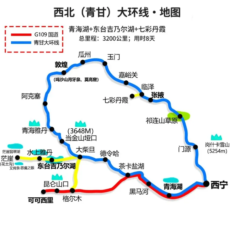行程安排:西宁→茶卡→大柴旦→茫崖→阿克塞→敦煌→嘉峪关→张掖→西宁(环线闭环,覆盖西北核心景观与历史遗迹)。