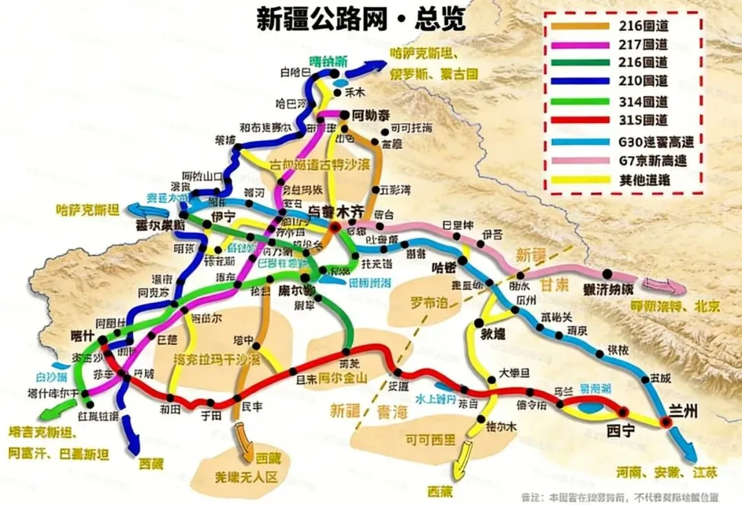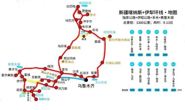 自驾信息:全程约3300公里,自驾需9-13天。全程路况整体良好,无论是新能源电车还是燃油车,都能顺利通行。除了独库公路、伊昭公路、琼库什台公路这三条线路以盘山路为主、对驾驶技术有一定要求外,其余线路均较为平坦笔直,整体自驾难度中等偏低。
