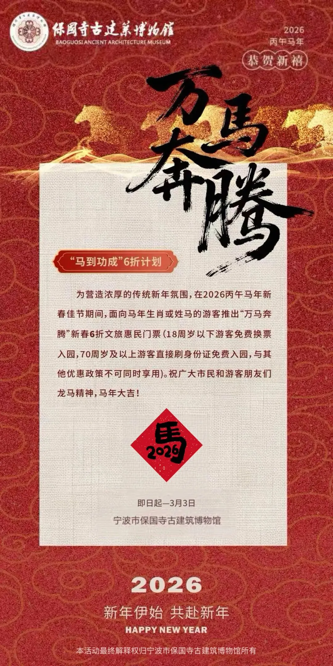 为营造浓厚的传统新年氛围,保国寺古建筑博物馆向公众推出 “寻马接福打卡” “马到功成6折计划” 新春惠民游,祝大家龙马精神,马年大吉!