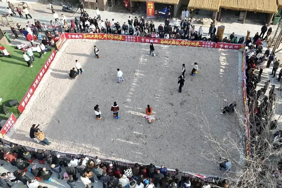 2月12日,在杨庄乡臧坪村柳州城,里三层外三层的游客把“梦回臧坪”乡村大舞台围得水泄不通。来得稍晚些的,只能踮起脚、伸长脖子,透过人缝往里瞅——台上,踩气球趣味比赛正酣,小将们争相上阵,呐喊声、欢笑声此起彼伏。