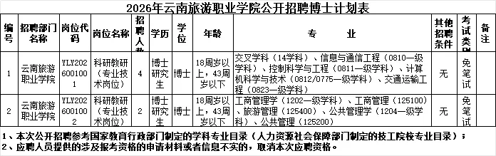 云南旅游职业学院2026年公开招聘博士6名。具体招聘岗位及招聘条件,详见《2026年云南旅游职业学院公开招聘博士计划表》(附件1)。