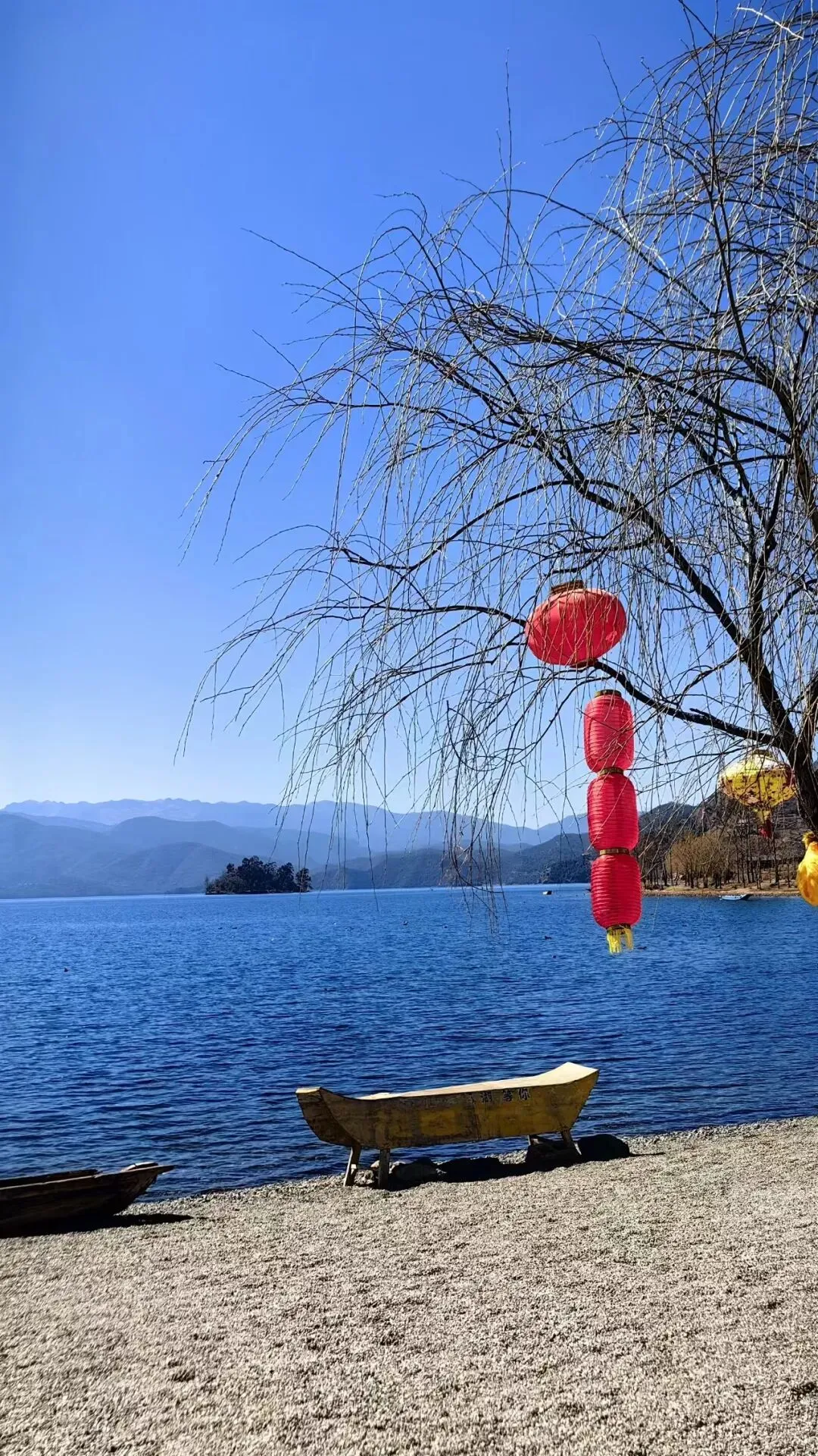 云南情人滩,开阔的沙滩、碧蓝的湖水,适合拍照。