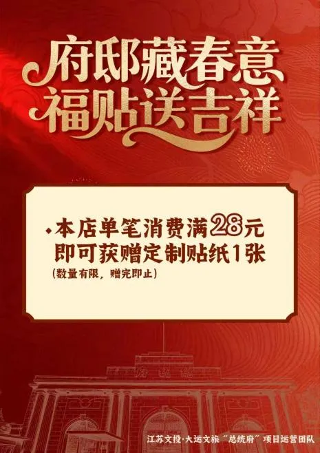 2月18日至22日每日10:00-17:00,在街区任意消费满28元,即可在1912文创小店领取“总统府”项目定制贴纸、新沂市马陵山景区门票等新春好礼;