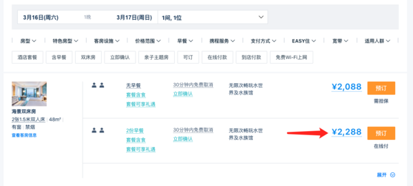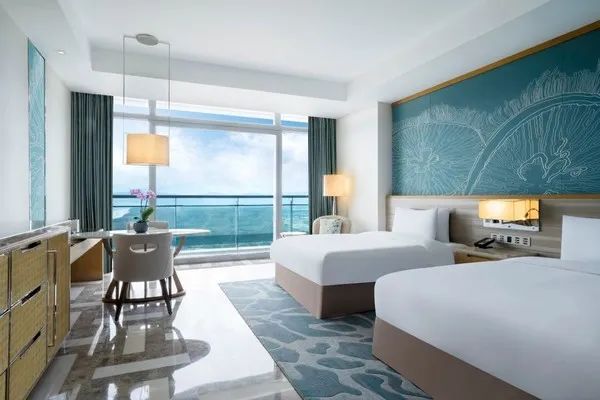 这次套餐给的都是海景房,面积48平,有2米特大床或双床房可选,双床房包含2张1.5米床,带俩娃也不成问题。套餐房型淡季日历房价也要2288起/晚呢,套餐2晚直接省下一千多,划算不少!