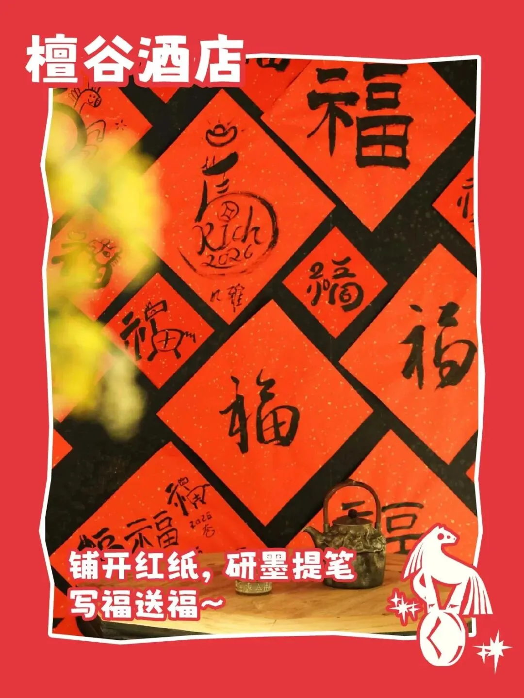🔴研磨写福字📍檀谷酒店春节期间入住檀谷酒店的客人,可亲自参与研磨写福字的活动,为新春添一份期许。