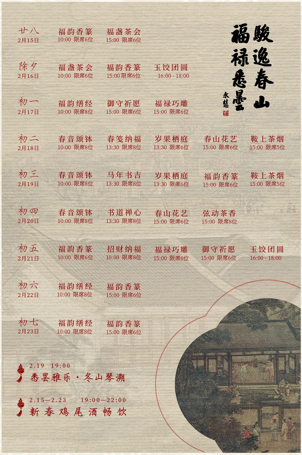 新春山居,不止山水相伴,更有指尖手作、耳畔乐声将中式年味凝于日常。春节期间,每日解锁不同新春体验,以慢时光赴团圆意。