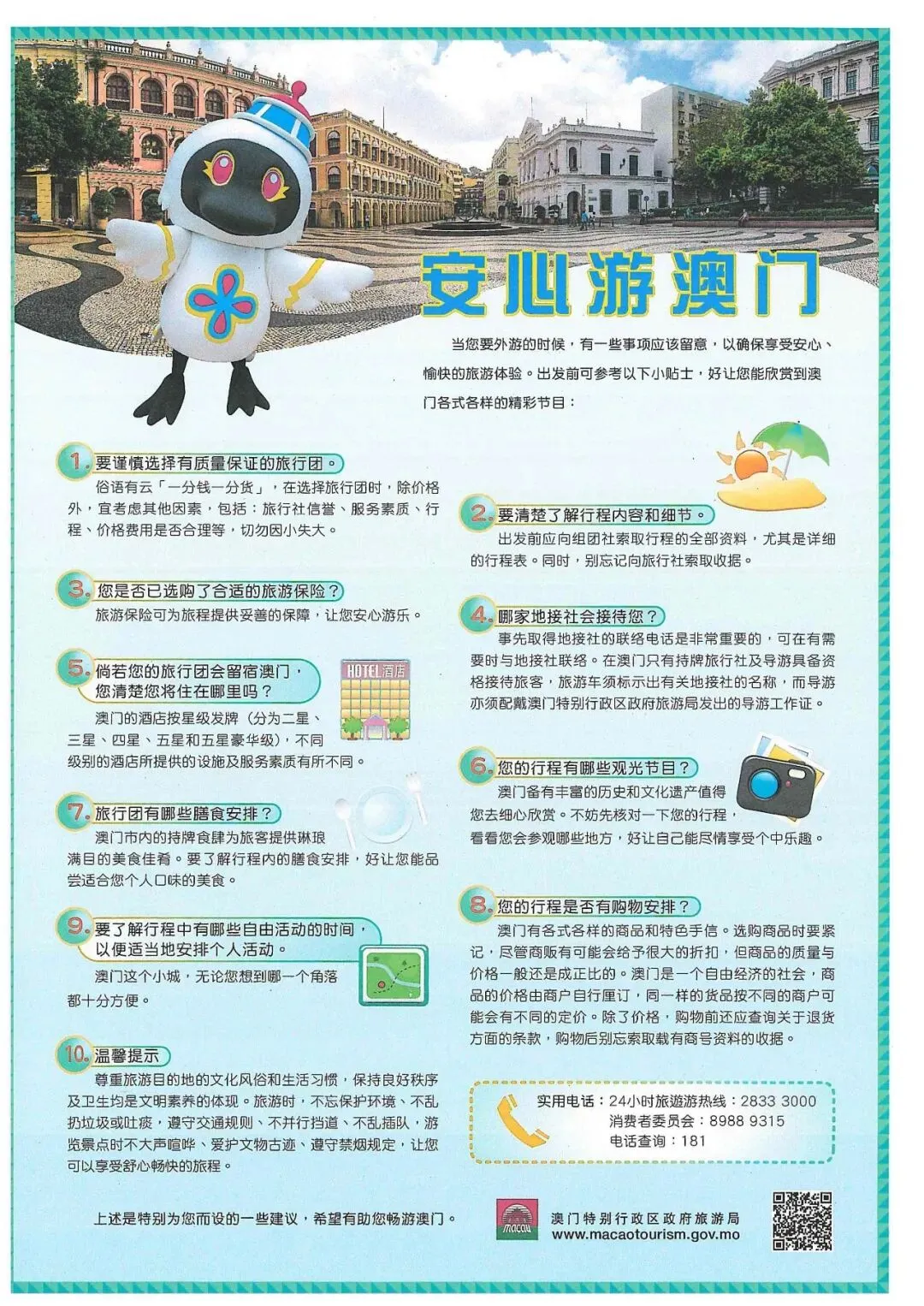 为了让旅客有安心愉快的旅游体验,澳门特别行政区政府旅游局制作了「安心游澳门」宣传单及环境卫生宣传海报,供旅客参阅,详细内容可扫描以下二维码查阅:
