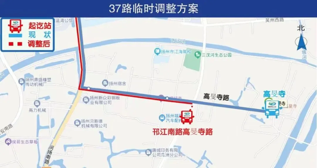 37路由瘦西湖路公交首末站始发,按原线路行驶至高旻寺路与邗江南路交叉口后,临时改道邗江南路运营至“邗江南路高旻寺路”站台,上下行线路走向一致,临时撤销“高旻寺”1站,新增“邗江南路高旻寺路”1站。