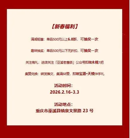巫溪县盛景老鹰茶有限公司,携山野灵气,为您呈献2026新春专属礼遇,让年味更有味!满减钜惠、关注有礼、积分兑换每份茶意都积累心意,积分可兑换限定好礼,让陪伴更有回响。