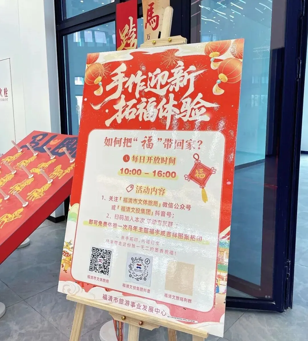 福字拓印:现场关注“福清市文体旅局”微信公众号或“福清文投集团”抖音号,并扫码加入本次活动官方微信群即可免费体验一次传统拓印。您可以亲手拓印出马年主题的“福”字或吉祥图案,这份独一无二的手作纪念品,让年味更有质感。