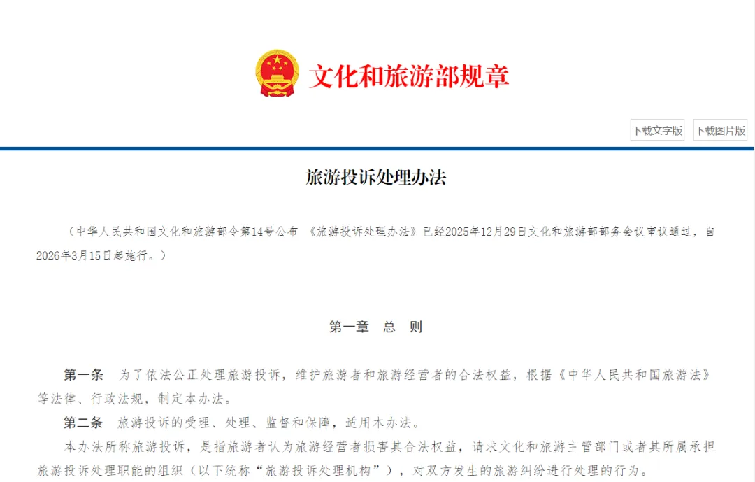 (中华人民共和国文化和旅游部令第14号公布 《旅游投诉处理办法》已经2025年12月29日文化和旅游部部务会议审议通过,自2026年3月15日起施行。)