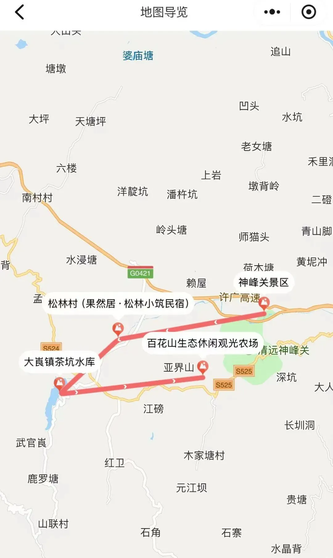神峰关景区→松林村(果然居·松林小筑民宿)→大崀镇茶坑水库→百花山生态休闲观光农场