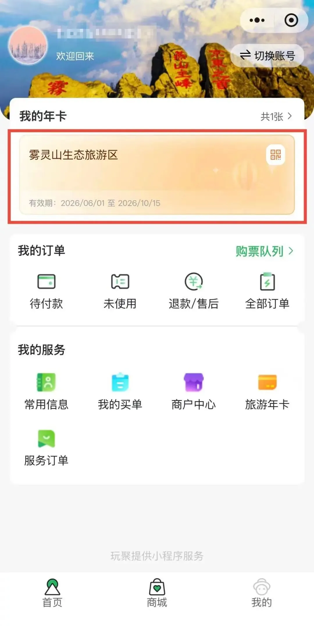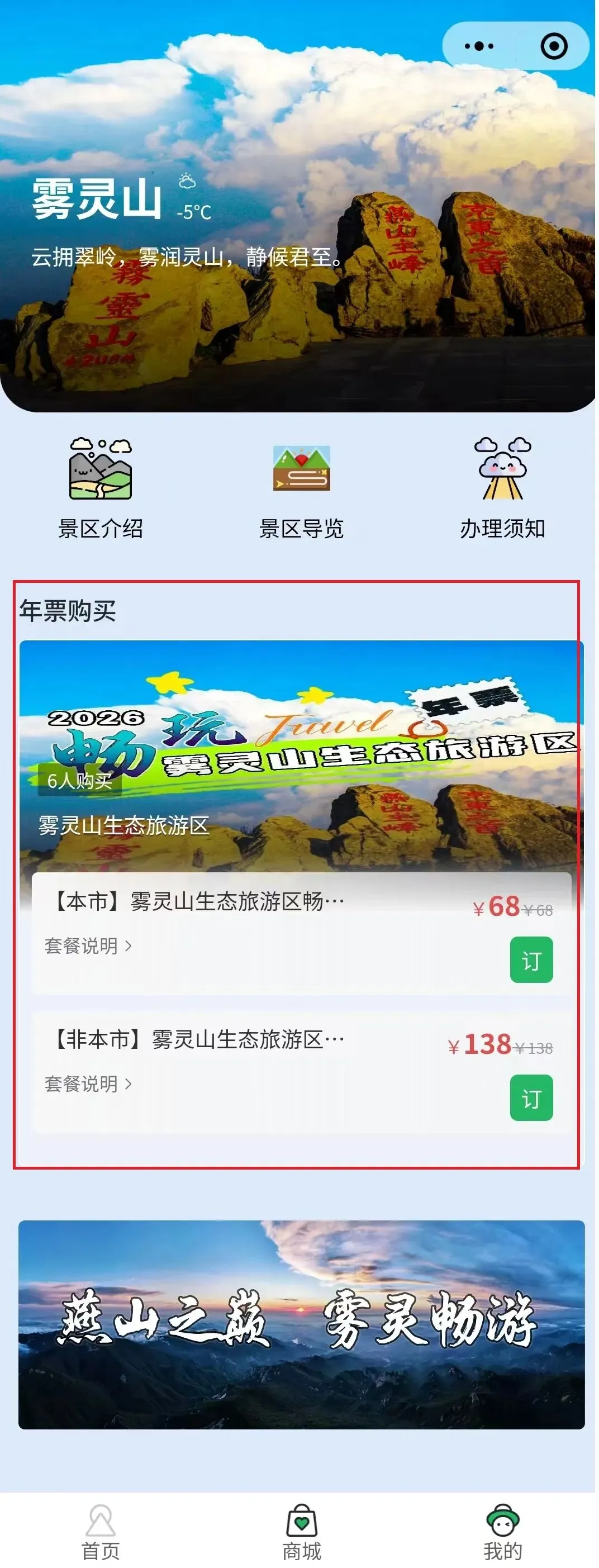 (2)在“雾灵山服务平台”小程序首页点击“年票购买”模块,选择需要新办的年票类型