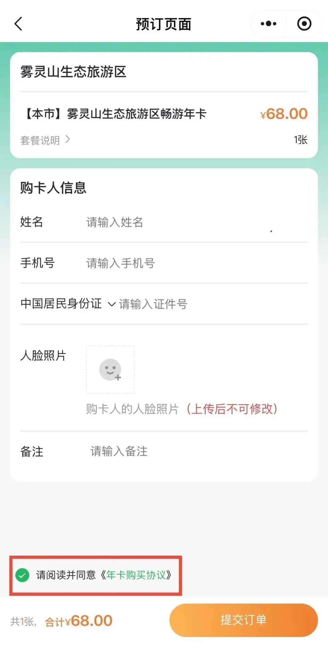 (3)确认年票类型,点击【预订】,准确填写购卡人信息(姓名、手机号、证件号),点击“人脸照片”进行上传,勾选《年卡购买协议》,提交订单。