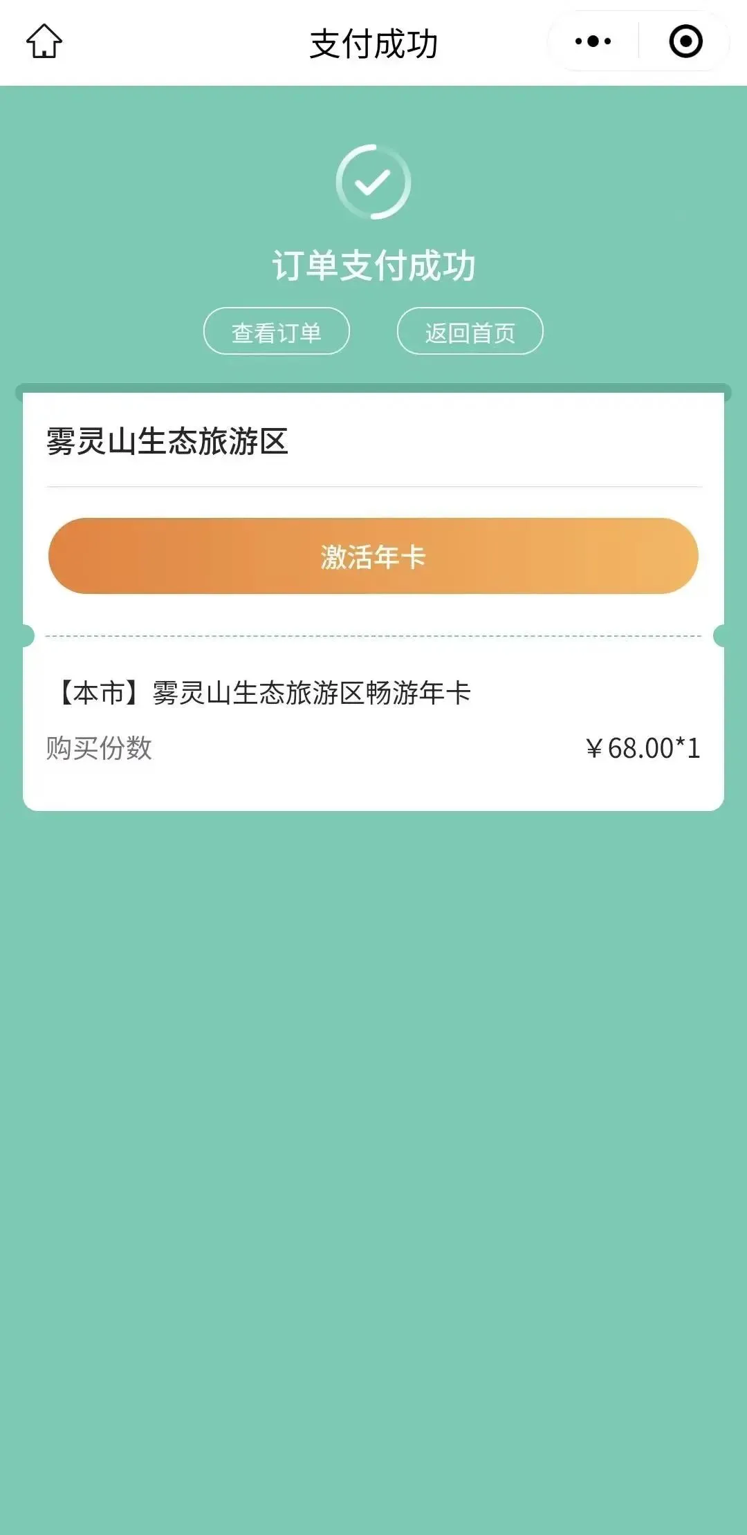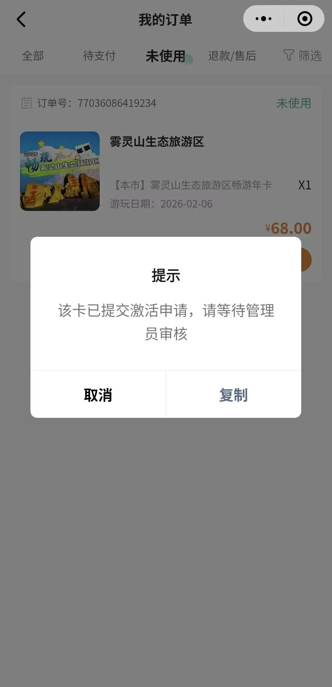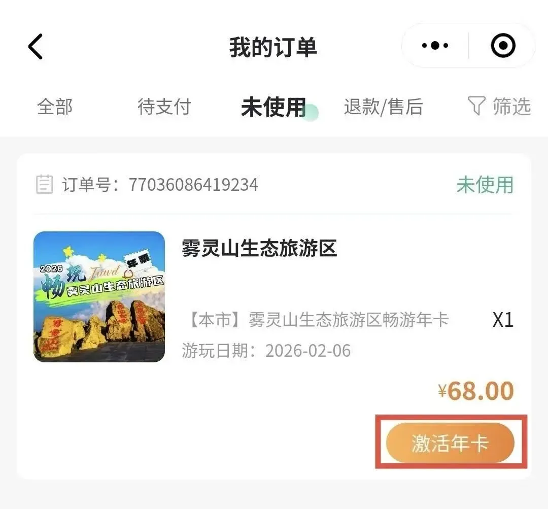 (1)在订单支付成功页面直接点击“激活年卡”,或返回“雾灵山服务平台”小程序菜单栏,选择“我的”-我的订单-选择“未使用”点击“激活年卡”