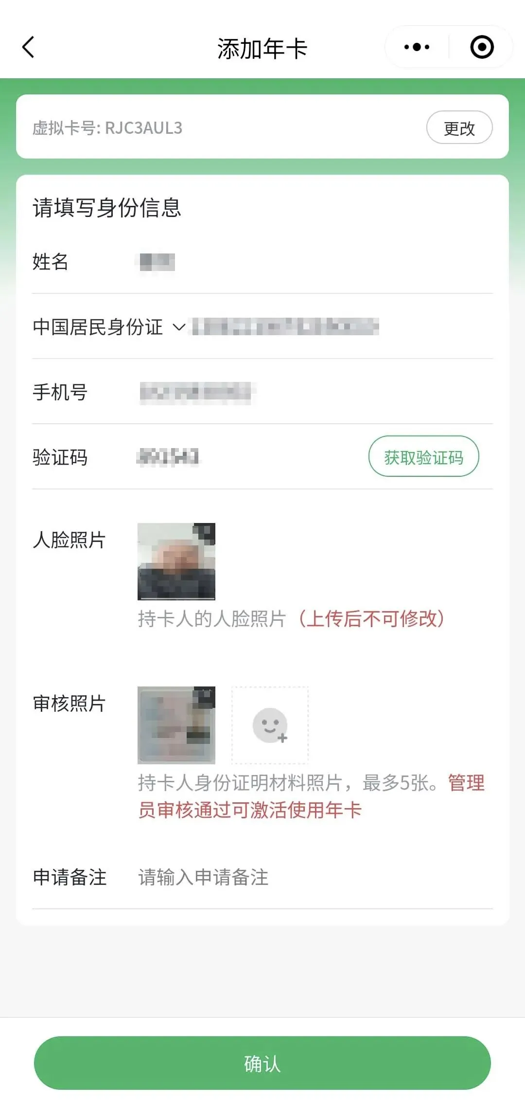 (2)填写身份信息:输入姓名、身份证号码、手机号、获取验证码,点击上传“人脸照片”“审核照片”,等待管理员审核。