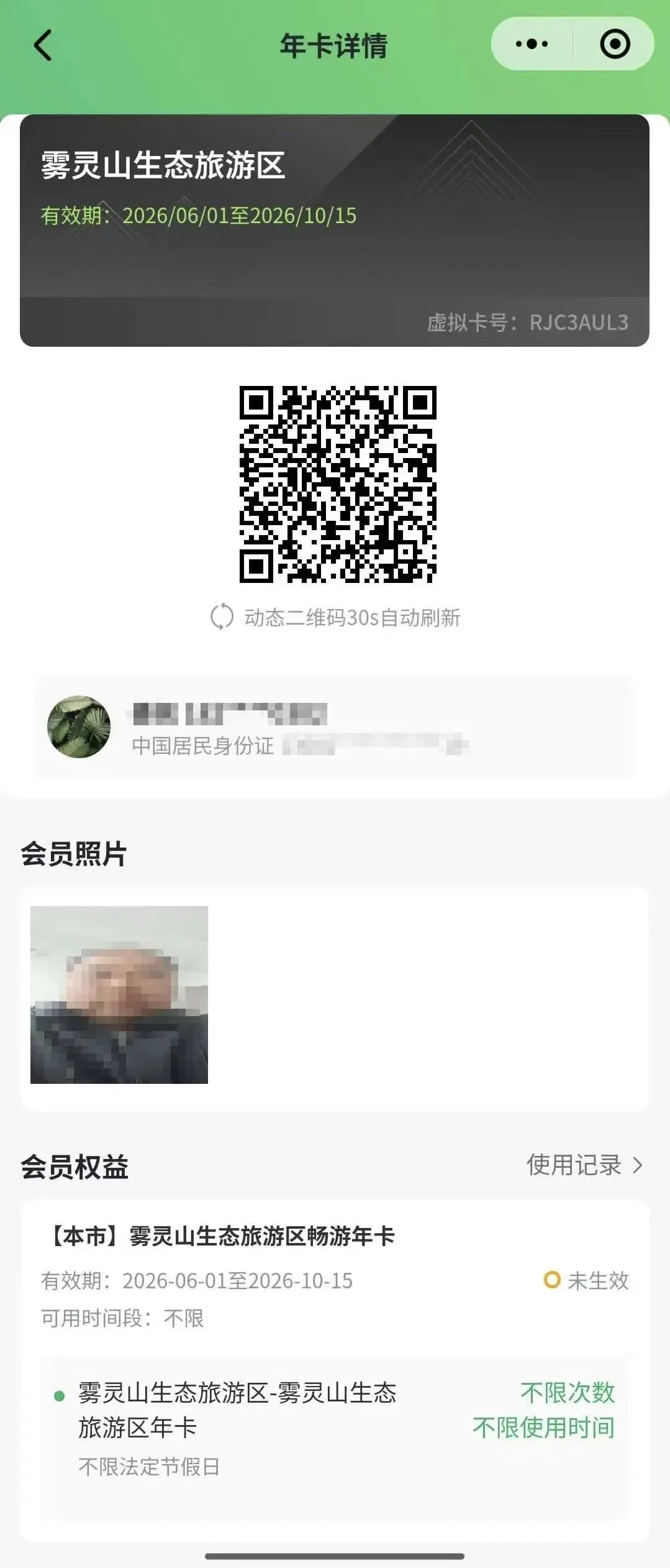 注:门票实行一人一票制,仅限持卡人使用。购买时请准确填写姓名、身份证号、手机号等信息。激活后,信息不可更改退。不得转借、冒用、造假,否则景区有权取消其享有的年票权益。