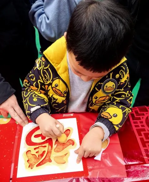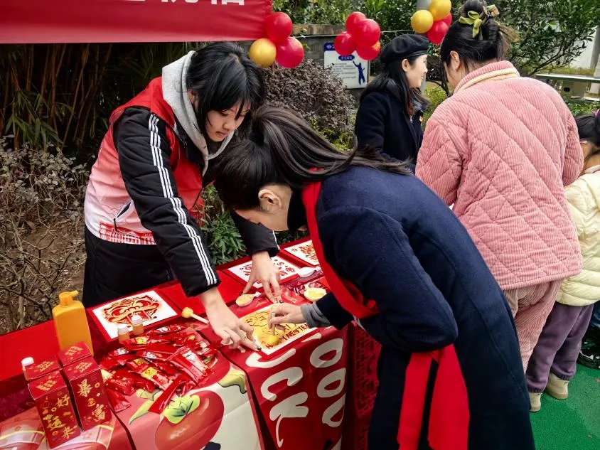 下午三点半,活动在热闹祥和的氛围中正式启幕。现场精心设置了“拓印送福”“笔墨传福”“智趣灯谜”“巧手剪窗花”四个民俗文化体验区,吸引了众多居民参与。在师生志愿者的热情引导下,居民们沉浸于传统技艺的魅力之中,通过拓印感受非遗厚重,用纸笔传递美好祝愿,猜灯谜碰撞智慧,剪纸展现巧手艺术,彰显中华传统文化的时代活力,也映照出社区和睦、文明共享的生动景象。活动让师生将礼仪服务、文化讲解、活动策划等专业知识转化为实际服务能力,真正实现了用专业服务社会,在实践中提升技能。