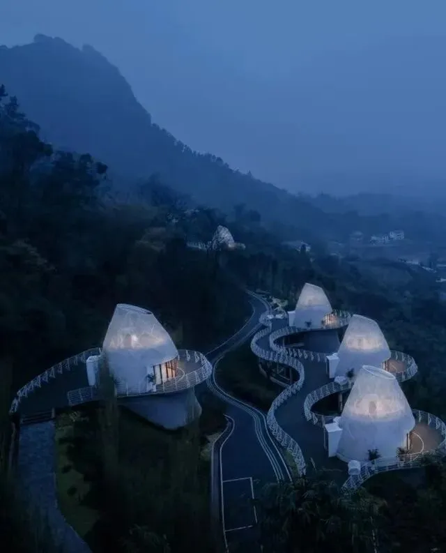 “半山”得名于山谷中的位置;“箨”指竹笋外层的壳。民宿建筑外形恰如其名,五栋包裹白色金属网的独栋,如破土而出的白色竹笋,呈向上生长之势。每栋为2层独栋,房型独立私密。