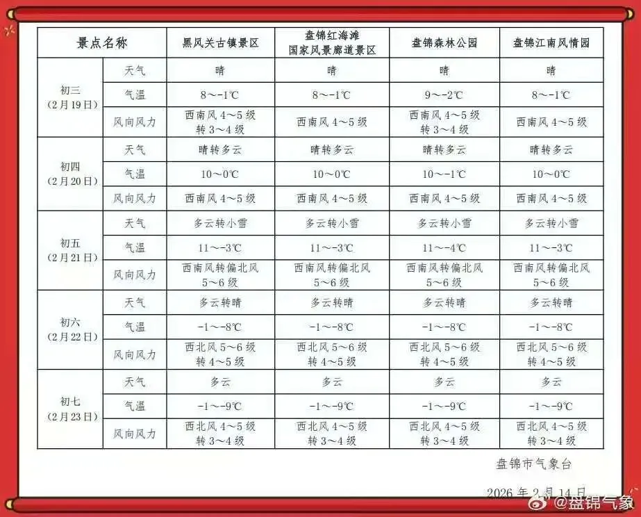 您现在的位置是:首页 > 国内旅游目的推荐 > 正文 国内旅游目的推荐 “春节”假日期间盘锦市旅游景区天气预报 admin2026年02月14日 16:52:32国内旅游目的推荐8 “春节”假日期间盘锦市旅游景区天气预报 转载请说明来源于"旅荐网",部分内容转载自网络,如有侵权请联系qlwl@foxmail.com删除 本文地址:https://www.15386.cn/post/106878.html 上一篇 春节放烟花不用愁,莒县这两处景点可合法燃放! 下一篇 荷兰旅游签2026材料清单,解锁郁金香与运河自由 相关文章 玉环岛蓝眼泪两天一夜旅游攻略(都市版) 2026年格聂旅游攻略,格聂最佳旅游时间?格聂旅游路线 东北自驾攻略:5条线路+高清地图,含住宿行程规划 甘南最优自驾路线,暑假必玩 苏州西山岛2天1夜自由行攻略|春日宝藏游,一站式解锁~ 亲测有效!出行旅游省钱攻略,人均500也能玩遍全场 【散文】猫子山望山记(附简介.旅游攻略) 北关岛蓝眼泪两天一夜旅游攻略(原生态) 下楼·就是旅行攻略 乌兹别克斯坦工业旅游的发展规划计划在包括Artel和UzAuto Motors在内的50家大型企业和设施组织参观 发表评论 取消回复 评论列表 这篇文章还没有收到评论,赶紧来抢沙发吧~