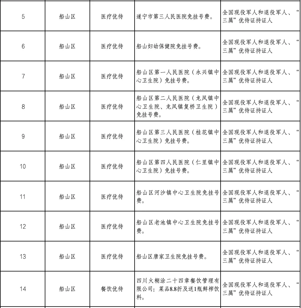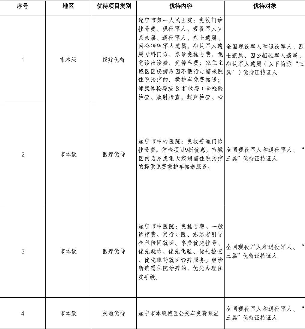 近日 遂宁市退役军人事务局 对已公布的4批次优待项目 进行了动态调整与优化 更新了优待目录清单 具体清单如下