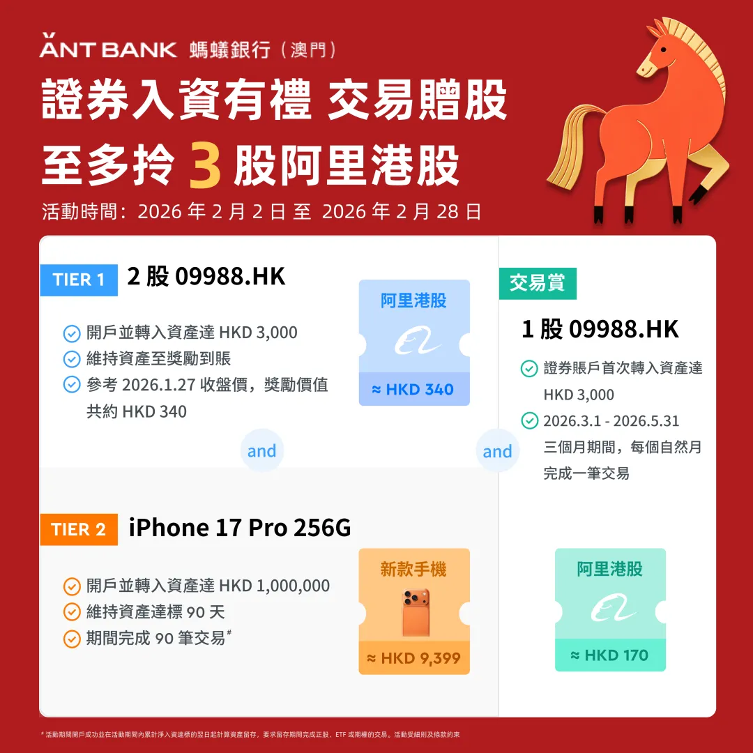 澳门蚂蚁银行开户攻略,最多可拿3股baba+iPhone 17 pro~