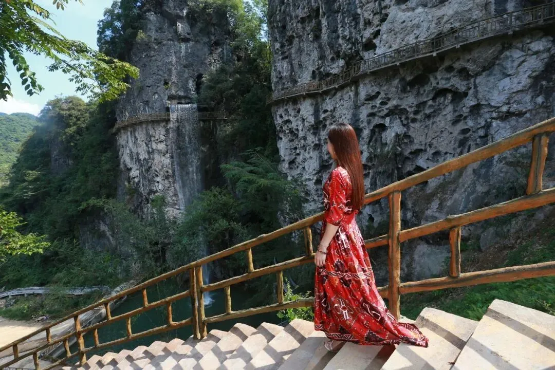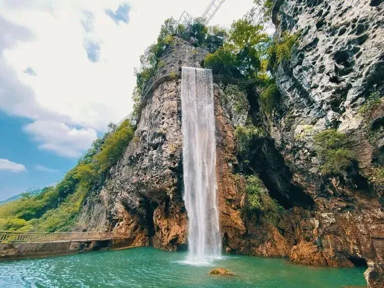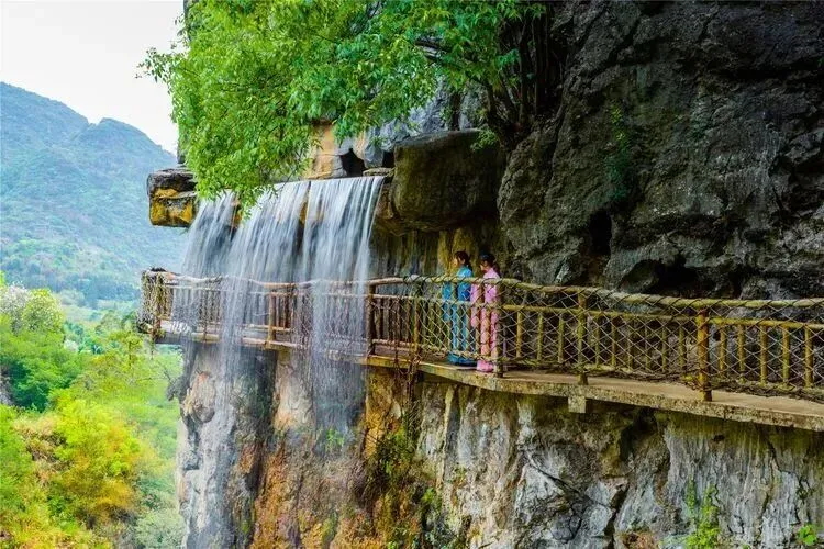 百米飞瀑,栈道穿瀑而过