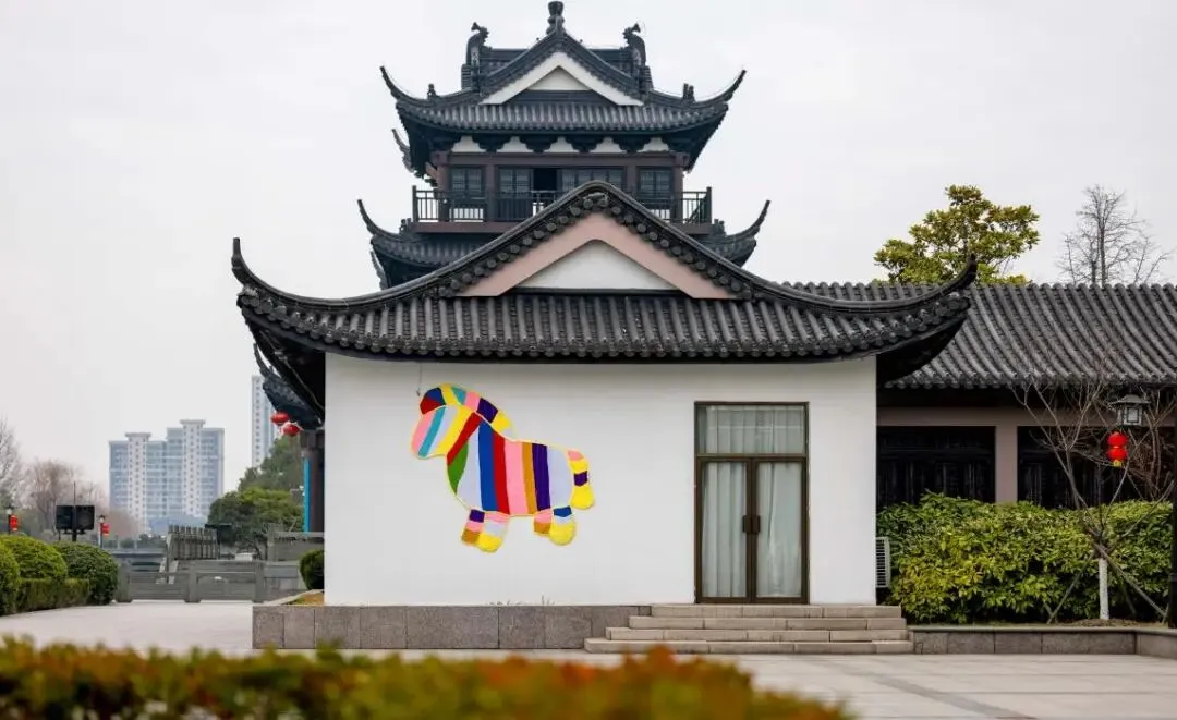 南村书堆建筑墙体用多色毛线编制的彩虹马,缠绕满天星灯带,萌趣又浪漫,寓意马年奔腾,彩虹映祥瑞!