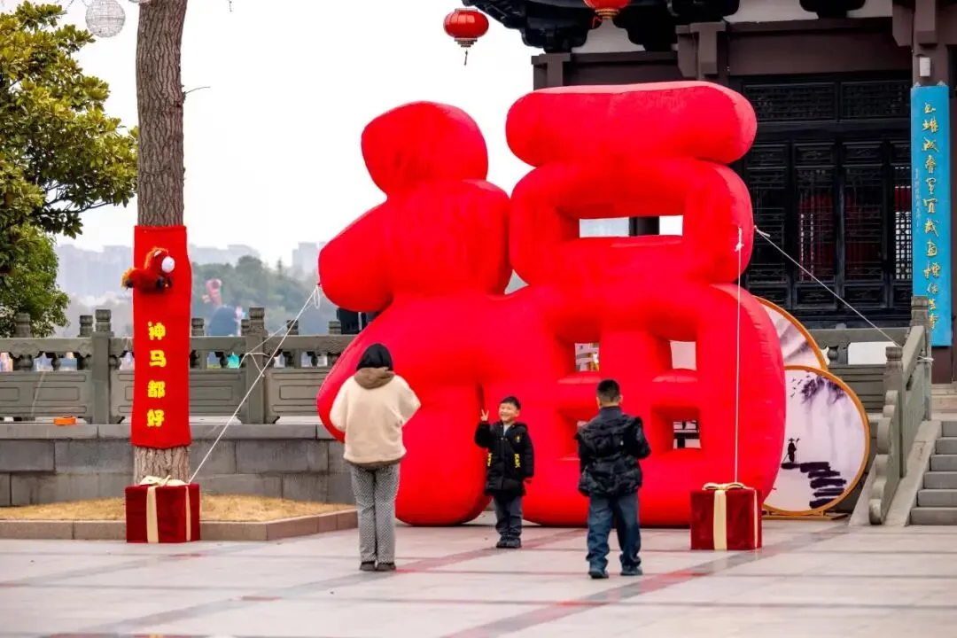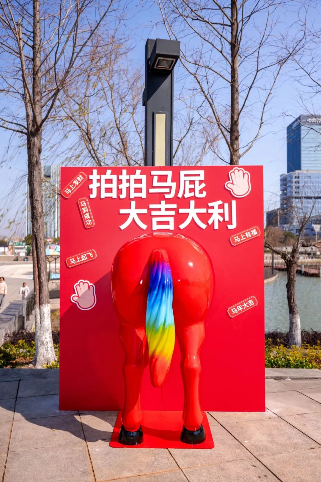 景区内,那个极具趣味的 “拍拍马屁 大吉大利”,绝对是打卡清单的 TOP1!红彤彤的马身造型格外吸睛,伸手轻轻一拍,仿佛就能接住马年的所有好运,趣味十足的互动设计,让每个人都能沉浸式感受新春的快乐。