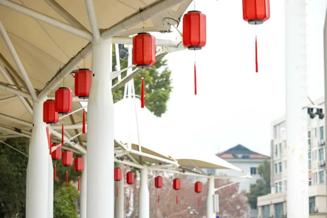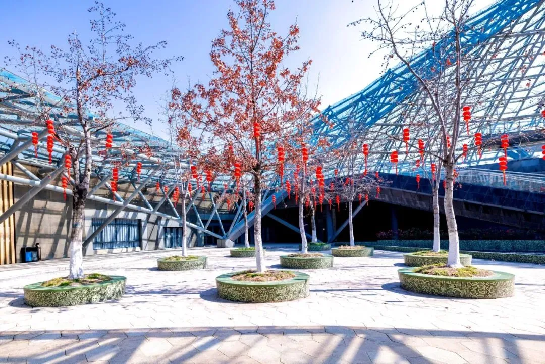 现代建筑的线条与新春的喜庆撞了个满怀。树木枝干上,一串串红灯笼错落悬挂,在暖阳下摇曳生姿,为硬朗的建筑轮廓添了几分温柔暖意。