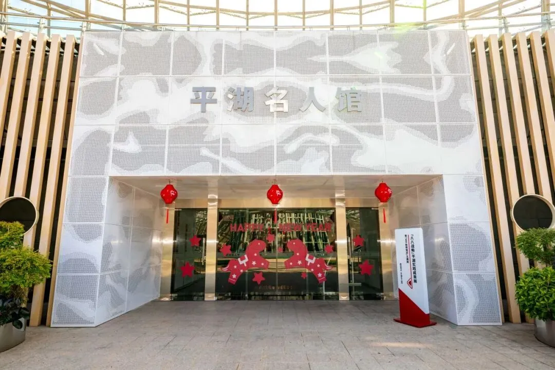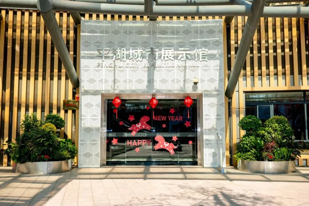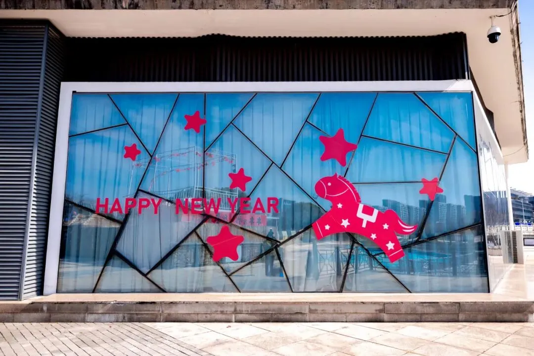 平湖城市展示馆与平湖名人馆的入口处以及明湖游客服务中心的玻璃上,年味氛围更是拉满。门口悬挂的红灯笼简约大气,红色的小马贴画灵动俏皮,搭配 “Happy New Year” 的字样,将马年的主题展现得淋漓尽致。