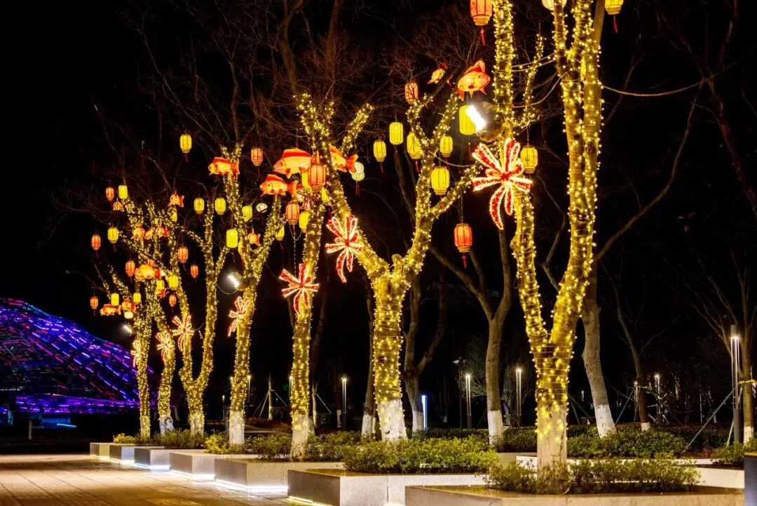 夜幕下的平湖“三馆一中心”,暖金色灯带裹住枝丫,新春灯笼与星芒彩灯交织出喜庆画卷。