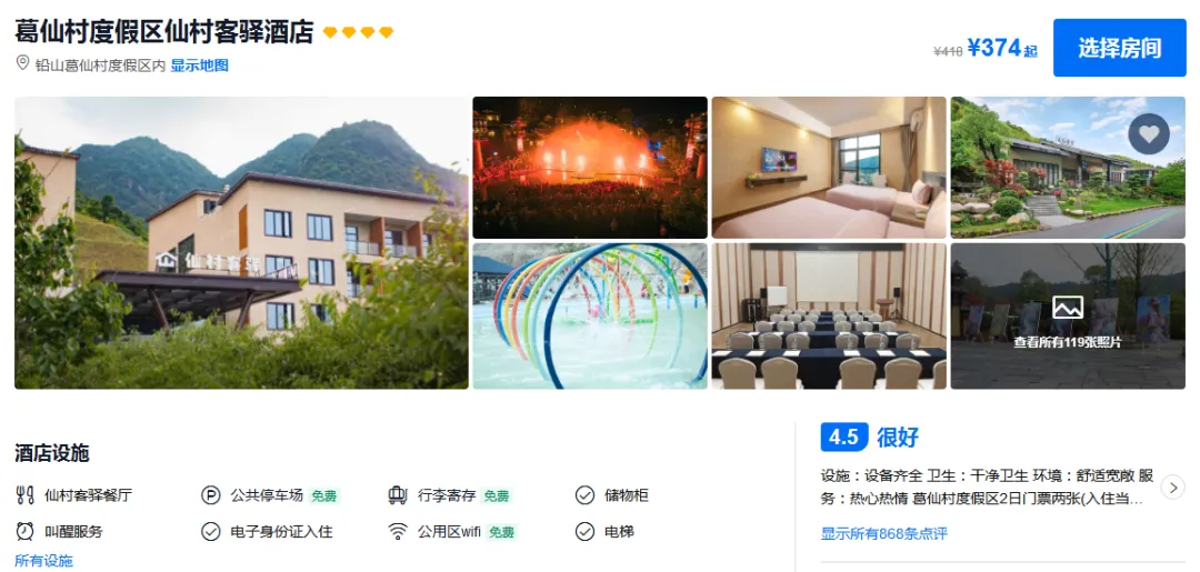 ▲连住2晚携程网评4钻酒店:1住四钻葛仙村景区酒店/1晚大觉山国际酒店;