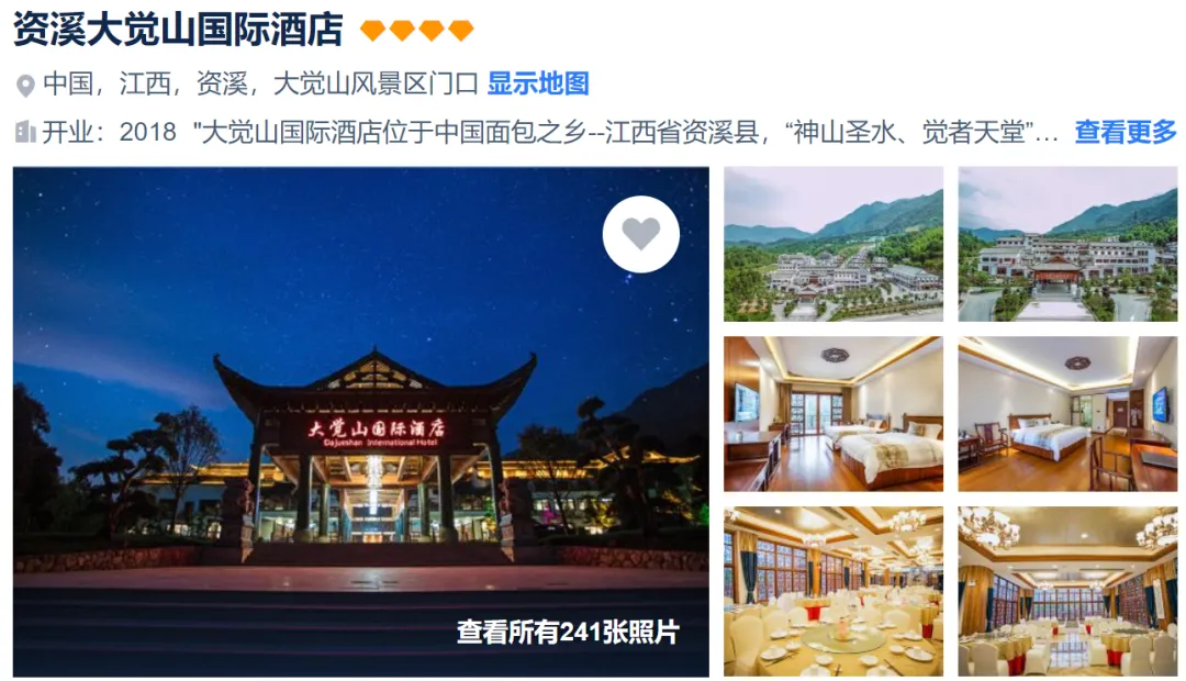 2、住宿:1晚葛仙山携程四钻酒店,1晚五星大觉山国际酒店等同级酒店(单人需补房差280元/人/2晚)