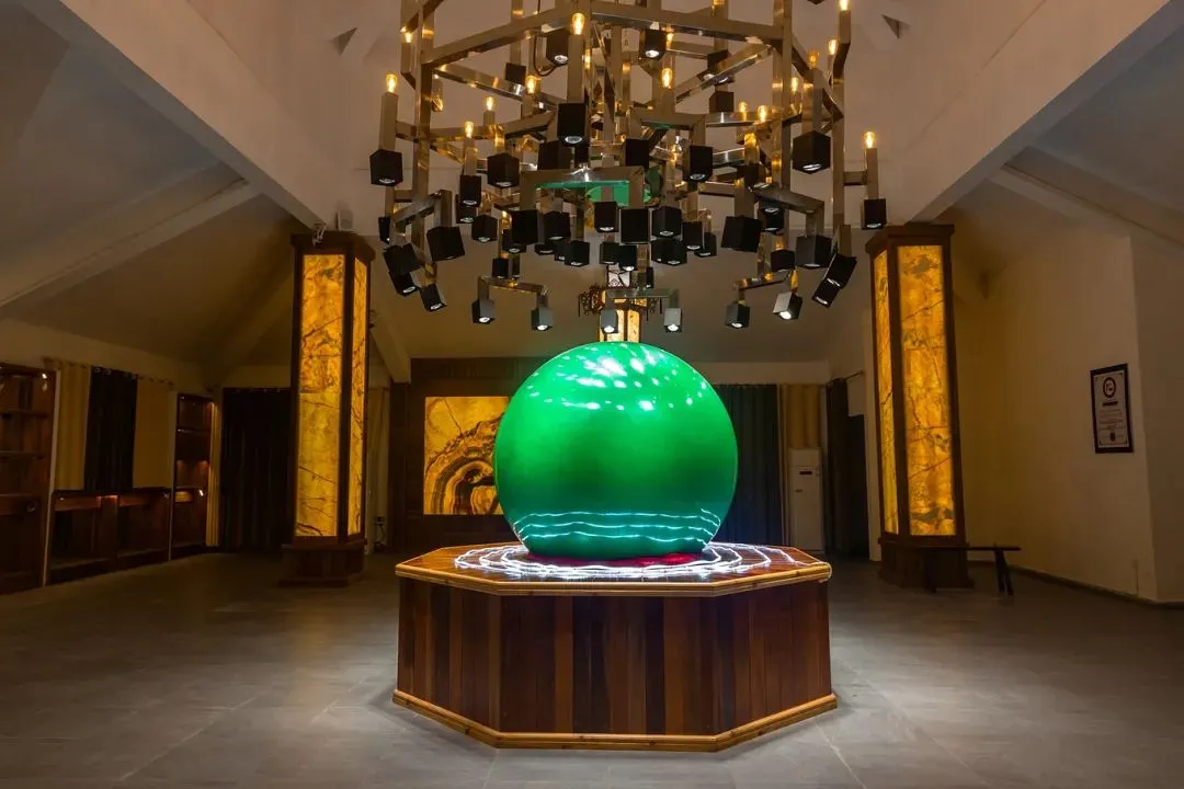 内部精致而简约的装饰最大程度的突显夜明珠特色。当灯光开启时,强烈的光线360°无死角的照射在夜明珠上,圆润的球体散发着透亮的光泽,让游客不禁感叹夜明珠魅力十足。