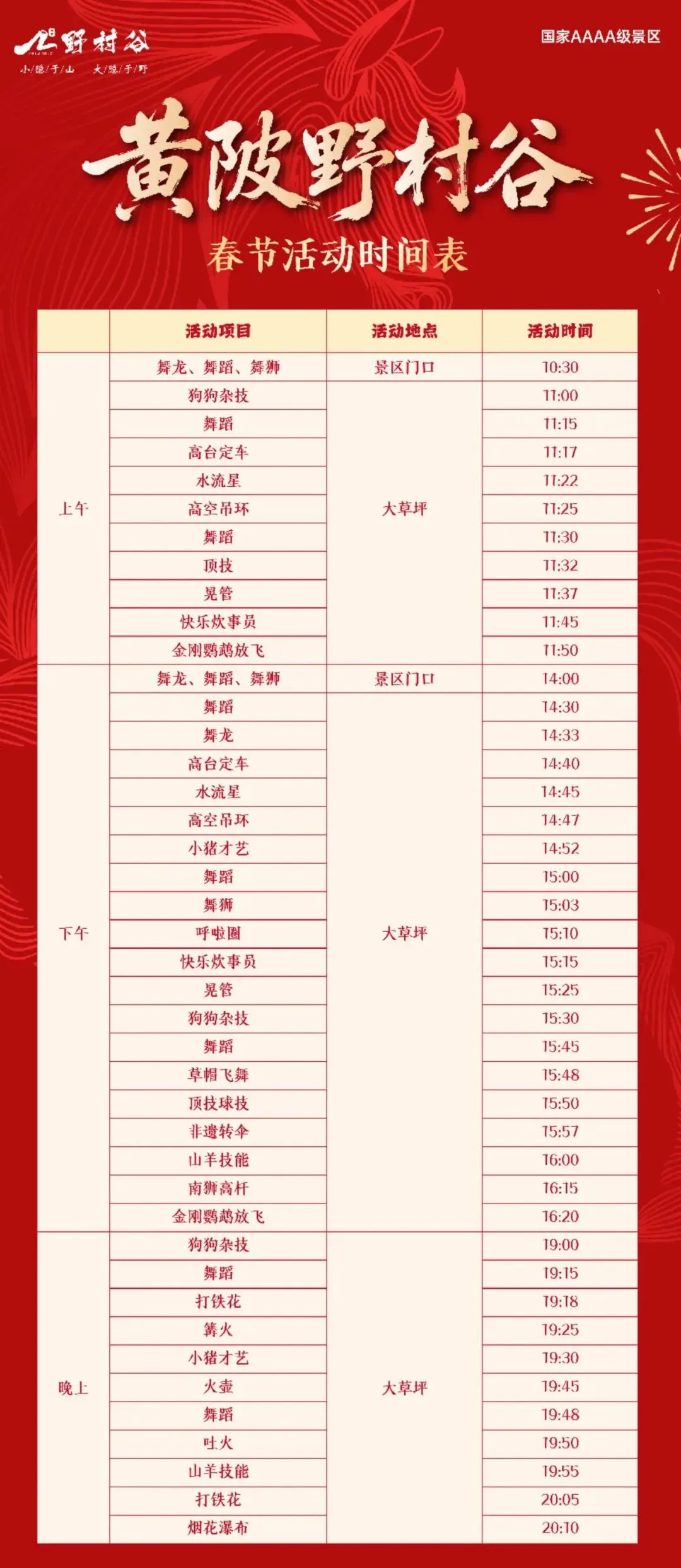 如遇雨天,部分户外表演可能调整,以现场广播和公众号通知为准 建议白天打卡拍照、看巡游,晚上看铁花、赏灯,一整天满满当当 入夜后气温较低,建议带上厚外套,暖宝宝有备无患 穿汉服或红色系衣服,拍照更出片 活动现场人流量大,请看管好老人和小孩