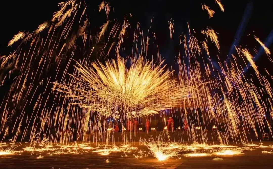1600℃的铁水被奋力击向夜空,“砰”的一声炸开,瞬间绽放成千万朵金色星雨,如瀑布倾泻,似流星坠落。这是流传千年的非遗绝技——打铁花。