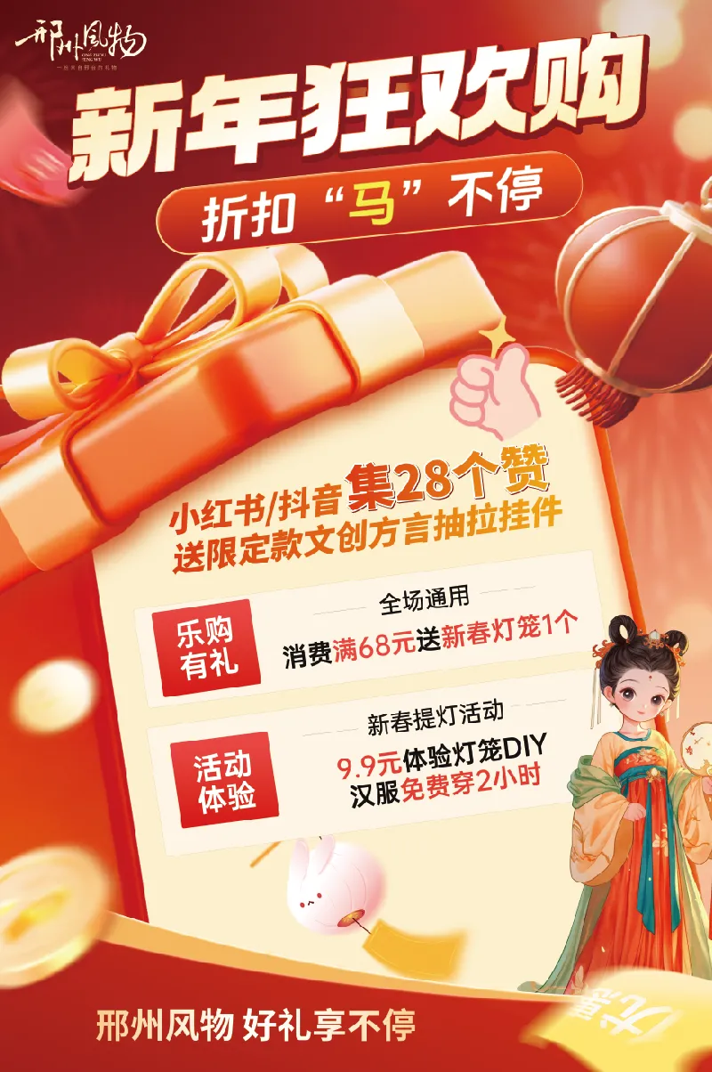 限定款文创抽拉挂件免费送 消费满68元即送新春提灯 💸 店内任意消费满68元 9.9元体验新春提灯活动 CHUNJIE 邢州风物欢迎您的到来!