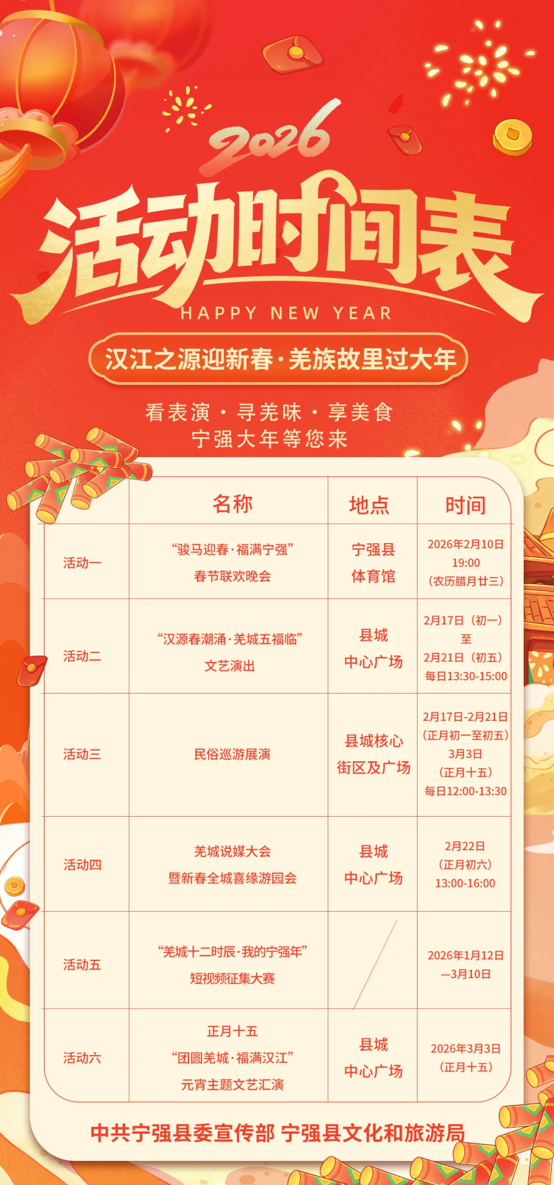 春节的脚步渐近,你是否已经厌倦了城市的喧嚣,渴望一场说走就走的旅行?宁强——这座藏在秦巴山脉深处的高铁小城,正用它独特的羌族风情、千年古镇的韵味、汉江源头的冰雪奇观和茶山上的静谧时光,为你准备了一份丰盛的春节文旅大餐。这个春节,宁强活动多多,详情请看下图。