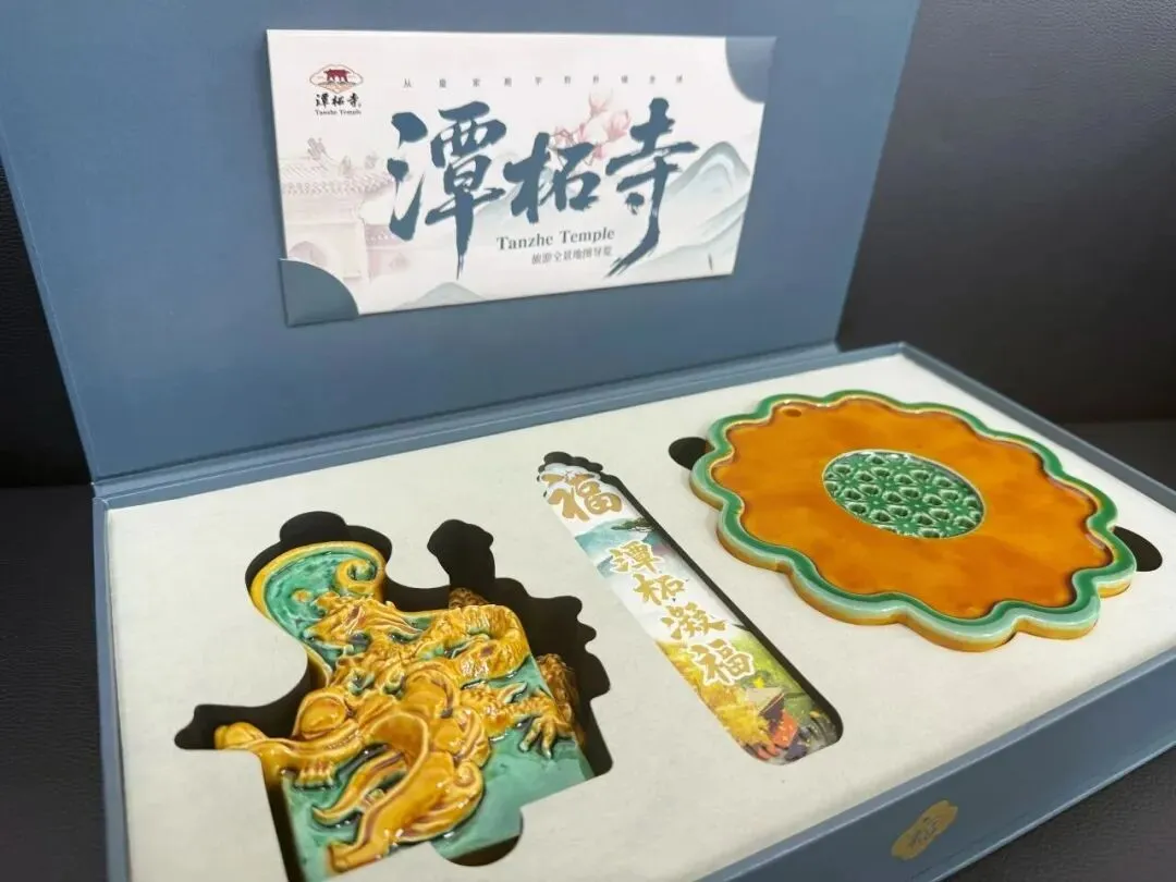“潭柘凝福”系列文创包含三交六椀琉璃茶台、琉璃鸱吻桌摆等,以两寺文化为根脉,以数字技术为桥梁,让千年古韵走出殿宇高墙,化作可触摸、可沉浸、可珍藏的生活美学。摆于案头,仿佛将两寺的祥和福运尽数纳入杯中,亦是共赴一场跨越时空“祈福平安”的文化之约。