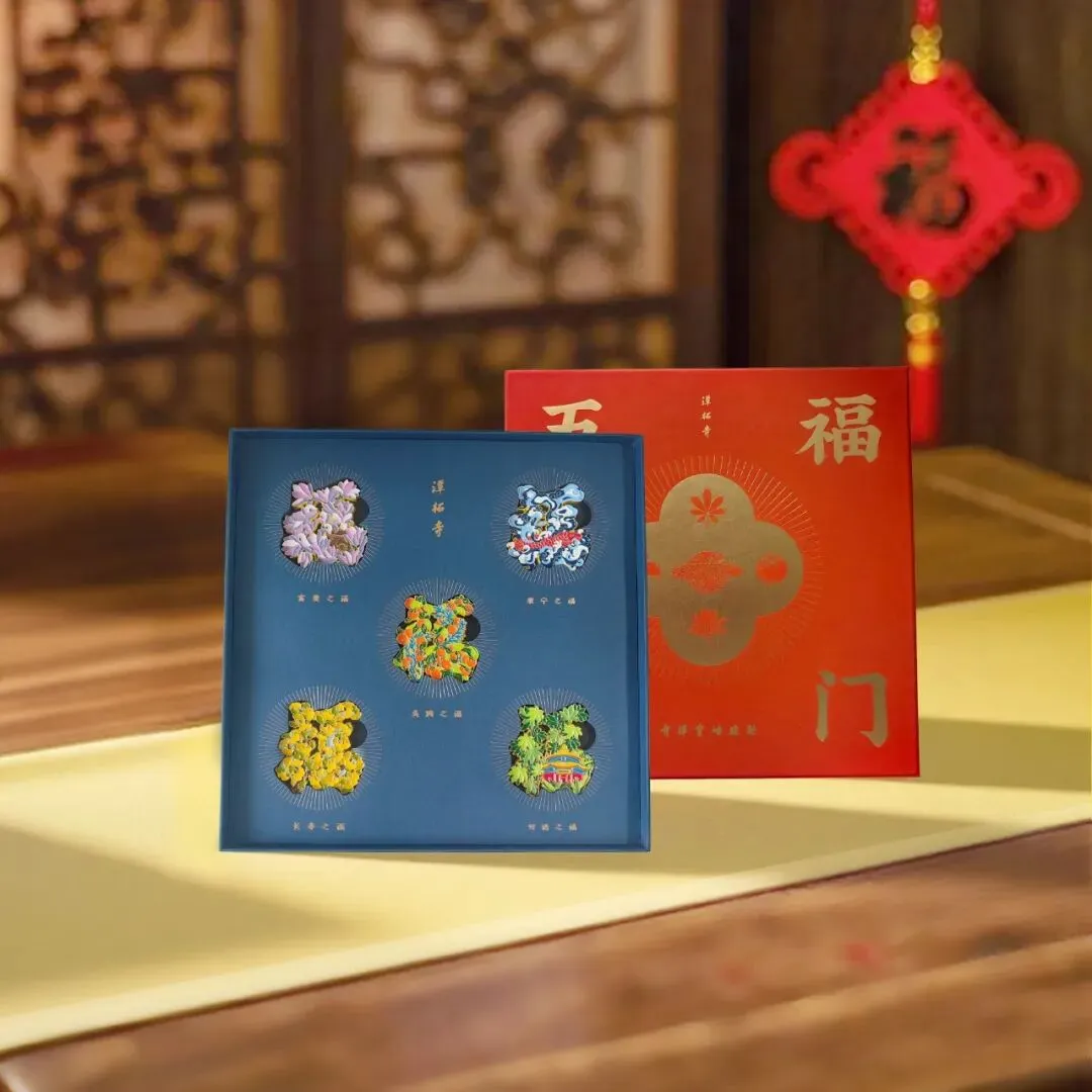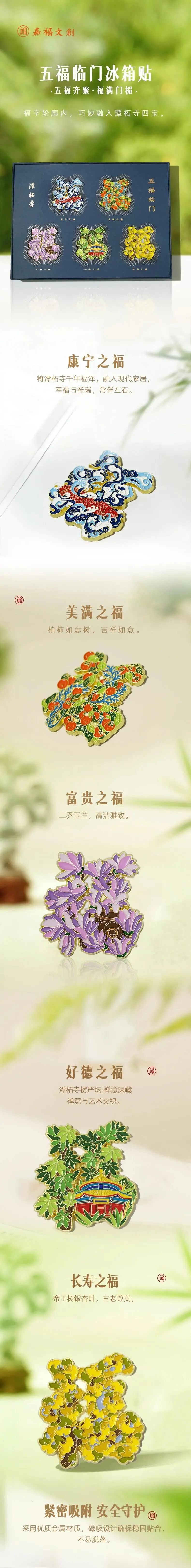 “五福临门”冰箱贴以潭柘寺金镶玉竹、百事如意树、石鱼、二乔玉兰、大铜锅、帝王树为元素设计五福临门冰箱贴,寓意富贵、康宁、美满、长寿和好德之福。