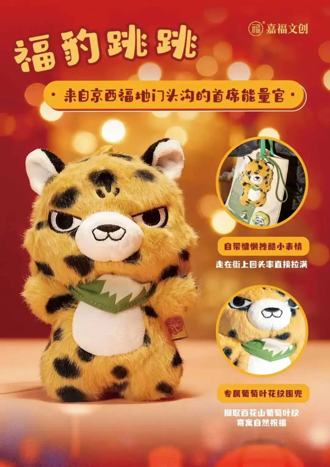 福豹跳跳,源自北京西山生态核心百花山自然保护区,是一只被赋予"京西福地首席能量官"称号的华北豹公仔。作为太行山北段生态廊道的萌态化身,它承载着华北豹种群重返历史栖息地的科学愿景与人文期盼。期待"太行山之王"华北豹的归来。百花山作为连接血脉的生态廊道,正静静等待王者穿越山岭,重返历史家园。跳跳,便是这份期盼的温暖化身。