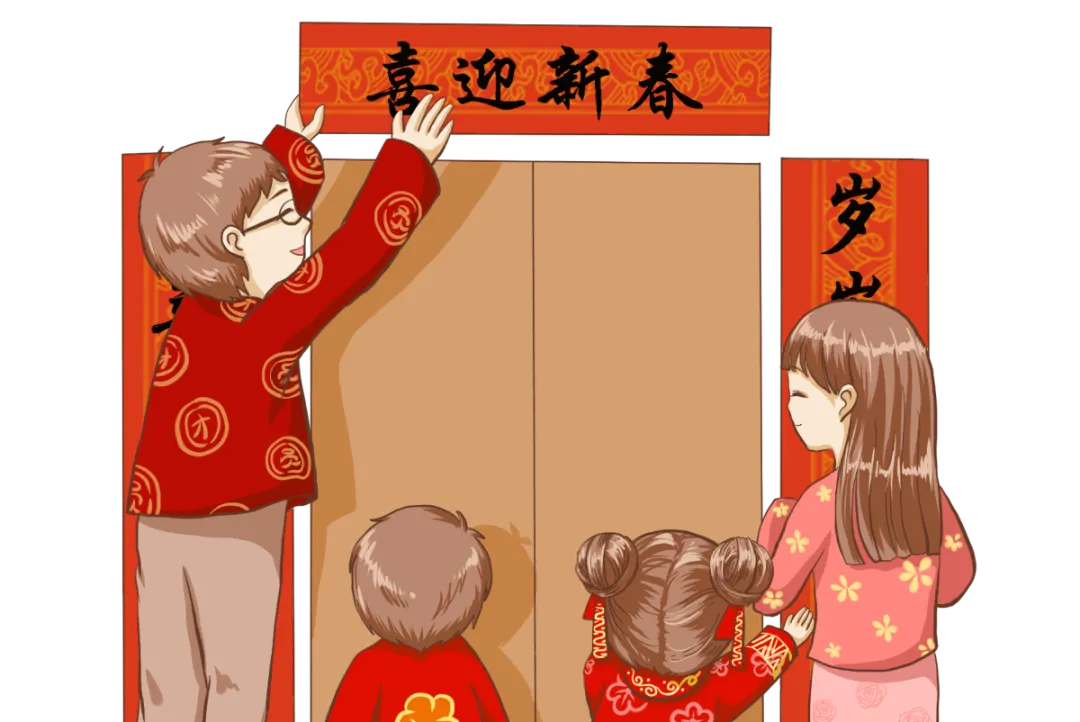 贴春联:从古代桃符演变而来,一笔一划书写新春期盼,红联映门,年味便瞬间拉满。