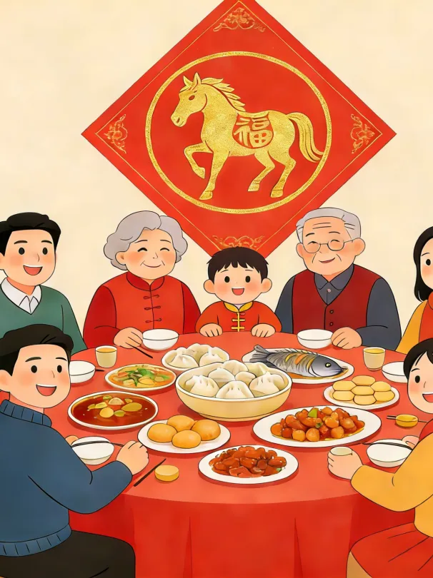 年夜饭:人间至味是团圆,一桌丰盛佳肴,承载着家人的牵挂,鱼(年年有余)、饺子(招财进宝)、年糕(步步高升),每道菜都藏着吉祥寓意。