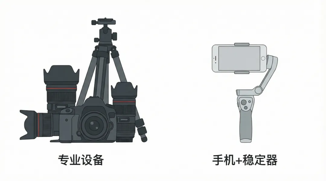 稳定器是必备。走路、跑步、有风的情况下,手持云台是刚需。大疆Osmo Mobile,两百到七八百,够用了。