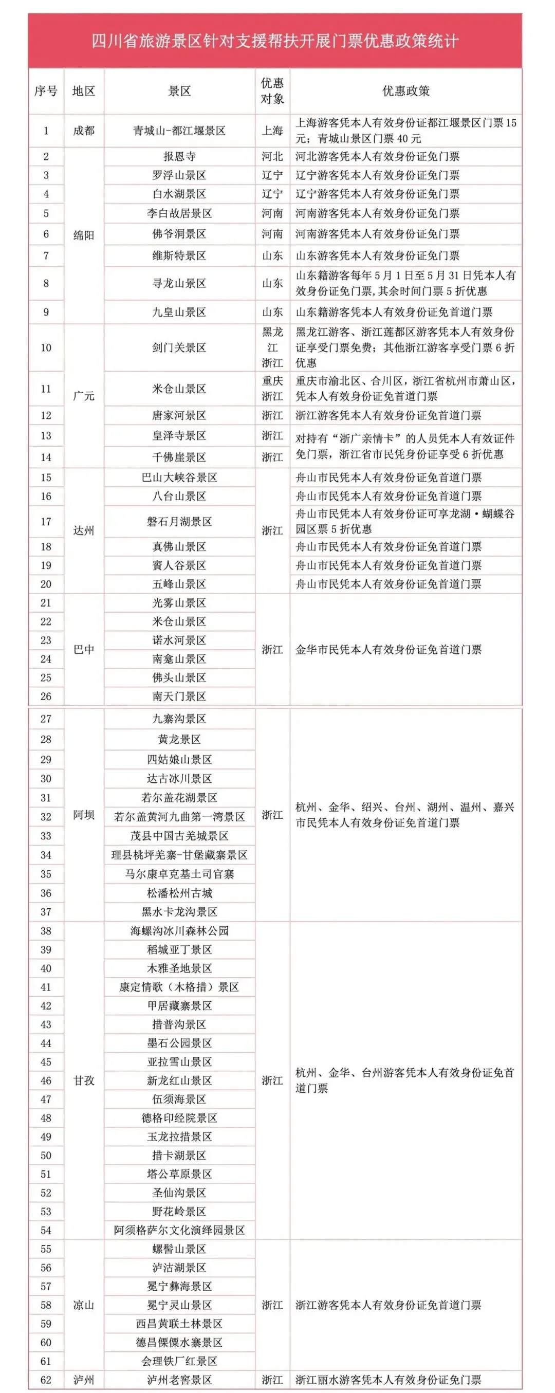 一省帮一县,恩情重如山,汶川特大地震后,举国千里驰援,与四川风雨同舟、并肩奋战。十八载春秋流转,巴蜀涅槃重生。援建恩情永不忘,四川记心上,免票或优惠票价政策正是真诚和质朴的感恩回馈。