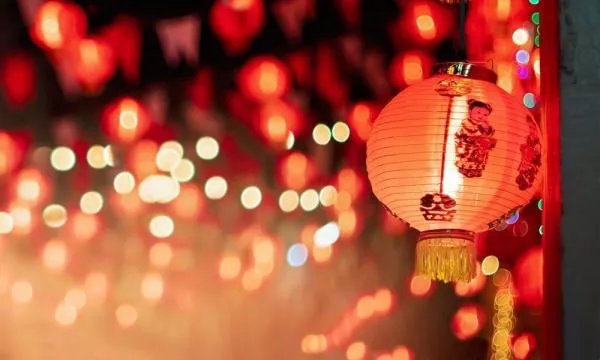 红灯笼缠绕枝桠,暖光在地面映出爱心光斑。